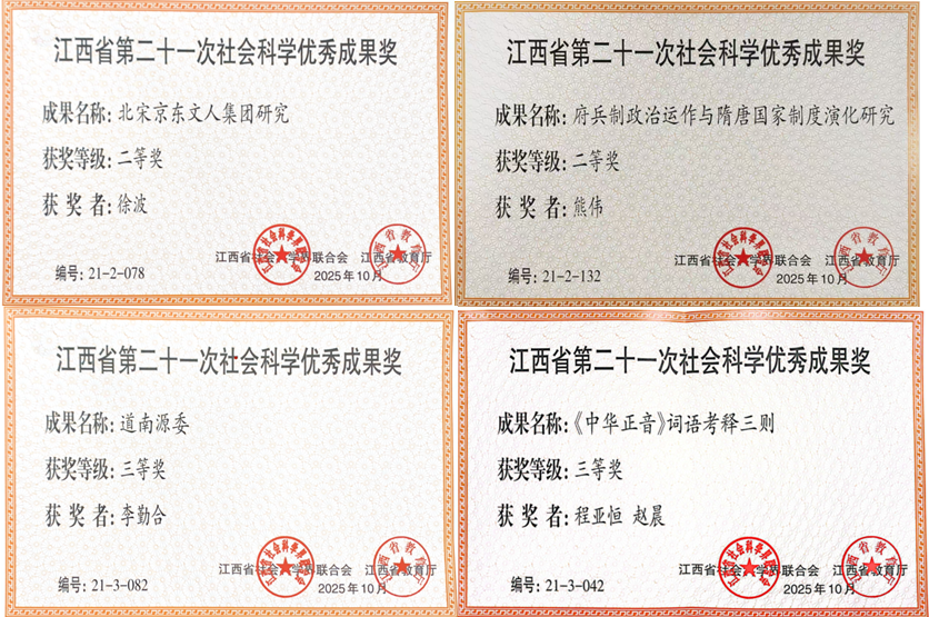 近日,江西省第二十一次社会科学优秀成果奖评选结果揭晓,我院科研成果再获佳绩,共斩获4项殊荣。徐波老师的专著《北宋京东文人集团研究》与熊伟老师的专著《府兵制政治运作与隋唐国家制度演化研究》荣获二等奖;李勤合老师的专著《道南源委》与程亚恒老师的论文《<中华正音>词语考释三则》荣获三等奖。充分彰显了在人文社科领域的深厚积淀与研究实力。