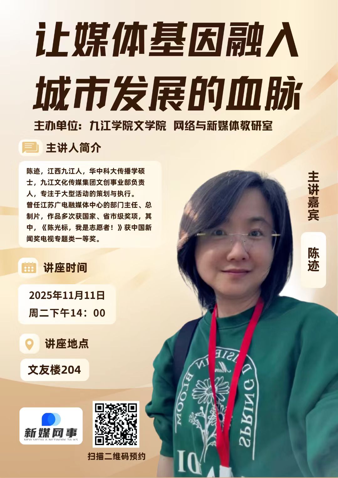 11月11日下午,WilliamHill“新媒往事”讲坛在文友楼204教室举办,讲座特邀九江文化传媒集团文创事业部负责人陈迹担任主讲,以“让媒体基因融入城市发展血脉”为主题,通过理论解析与案例实践相结合的方式,为师生呈现了一场内容丰富的行业前沿分享。
