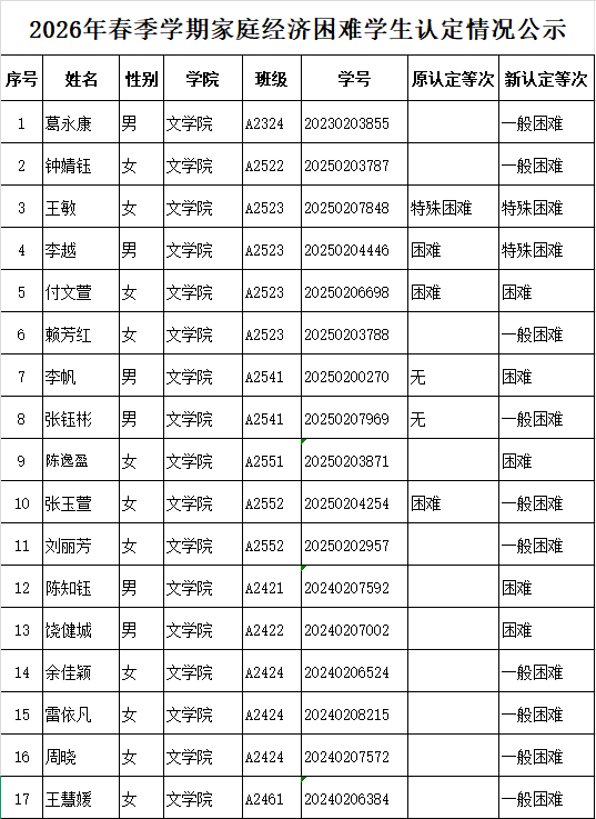 根据《江西省教育厅等七部门关于印发江西省家庭经济困难学生认定暂行办法》的通知(赣教发[2019]6号)、江西省教育厅《关于印发〈江西省学生资助工作操作规程〉的通知》(赣教助〔2025〕1号)及《关于印发《威廉中国官方家庭经济困难学生认定操作规程》等系列文件的通知》(九院字[2025]81号)文件精神,经个人申请,班级评审、年级审核、WilliamHill家庭经济困难评审工作小组研究,葛永康等17名同学作为2026年WilliamHill春季家庭经济困难学生认定人选。现将其有关情况公示如下: