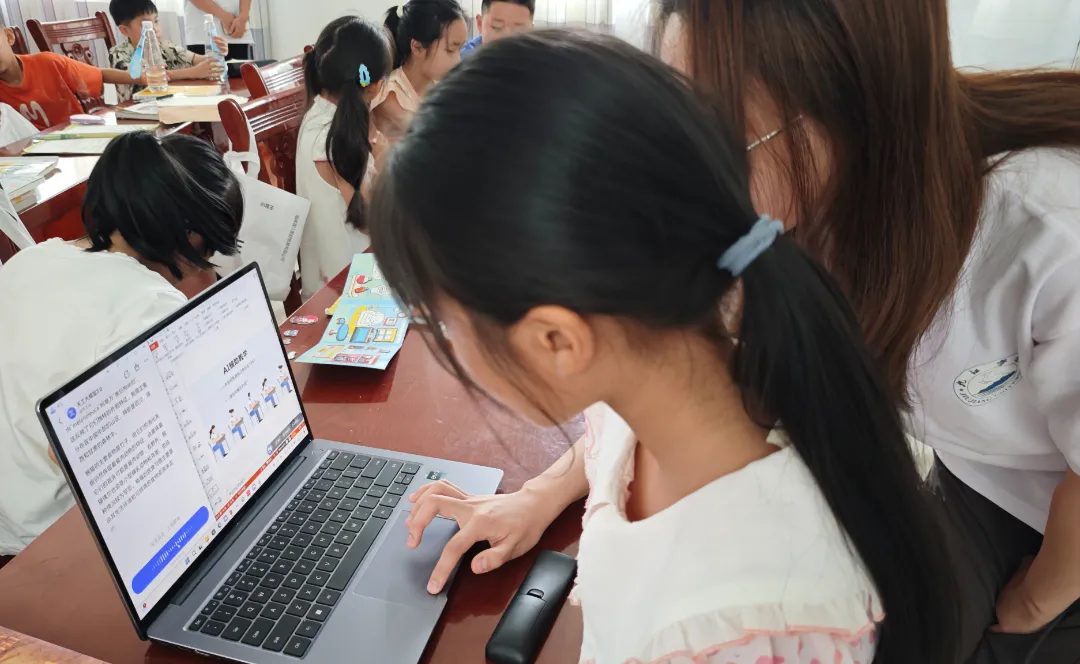 (队员熊欣悦带领小朋友们学习如何使用AI软件解疑答惑)