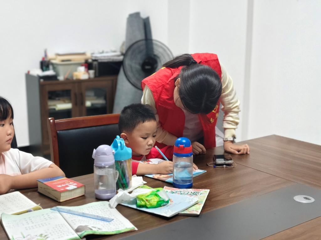 主题宣讲结束后,五位志愿者迅速开启作业辅导模式。他们根据小朋友的年级和学科分工,耐心答疑解惑:有的蹲在桌前,手把手教低年级孩子握笔写字;有的俯身演算,帮高年级学生梳理数学解题思路;遇到孩子对知识点困惑时,志愿者们还会用“就像英雄坚持战斗一样,我们也要坚持把难题弄懂” 的话语鼓励,让学习变得更有动力。现场氛围温馨,孩子们的疑问逐一化解,脸上渐渐露出笑容。