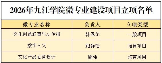 其中,韩恩花老师团队申报的《文化创意叙事与AI传播》微专业,成功立项为校级一般项目;鲍静怡老师团队申报的《数字人文》、熊伟老师团队申报的《文化产品创意设计》立项为校级培育项目。