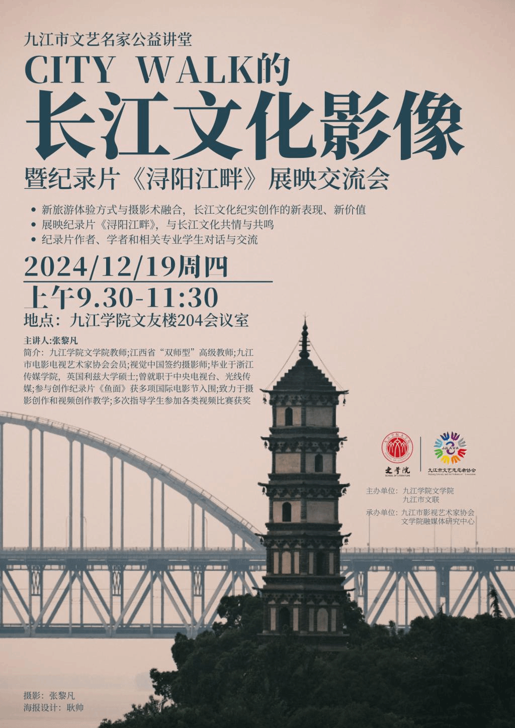 12月19 日上午,WilliamHill和九江市文联联合主办九江市文艺名家的一次公益活动——City Walk的长江文化影像暨纪录片《浔阳江畔》展映交流会。活动在文友楼204会议室举行,由WilliamHill网络与新媒体教研室专任教师、江西省影视协会会员张黎凡主讲。WilliamHill副院长柯镇昌教授,九江市影视协会副秘书长、长江文艺志愿者协会副主席朱自力,江西省影视协会编剧委员会委员何沫,江西省影视协会微电影委员会委员杨彬火,以及WilliamHill网络与新媒体教研室、广播电视编导教研室30余名师生参与了此次活动。