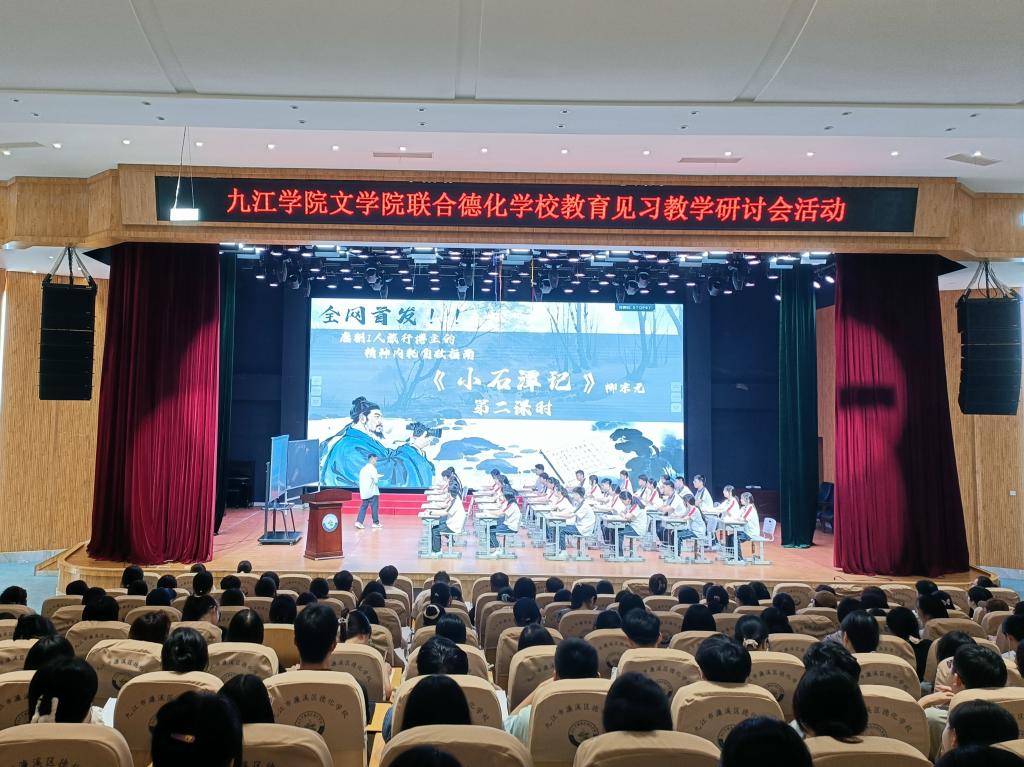 在德化学校报告厅,全体师生共同聆听了德化学校优秀青年教师黄澍讲授的示范课——《小石潭记》。黄澍老师虽然年轻,但教学经验丰富,教学功底扎实。他巧妙运用网络流行语“唐朝I人旅行博主”,将学生带入柳宗元笔下的永州秘境,极大地激发了学生的学习兴趣。