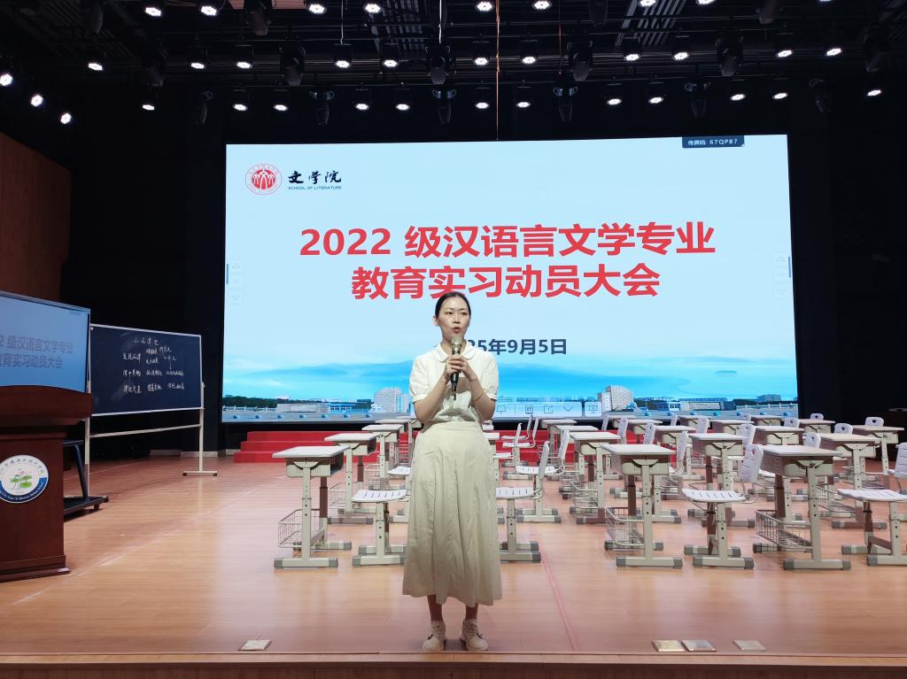 吴雯雯在总结发言中指出,实习是高等教育中不可或缺的重要环节,是理论知识与实践操作相结合的关键桥梁。她强调专业是每位同学的立身之本,专业所要求的素养包括口头表达能力、书面表达能力和教育能力等,背后蕴藏着言语能力、沟通能力、理性思考能力、批判性思维能力、审美评鉴能力等。教育实习不仅能够帮助学生检验所学知识的实际应用能力,更能够让师范生在真实的工作环境中锻炼自己的职业素养、团队协作能力和解决问题的能力。她希望全体实习生能够注意个人身份的转变,了解书本上不能了解的知识,学会做事,学会做人。最后,她再次强调了安全问题。