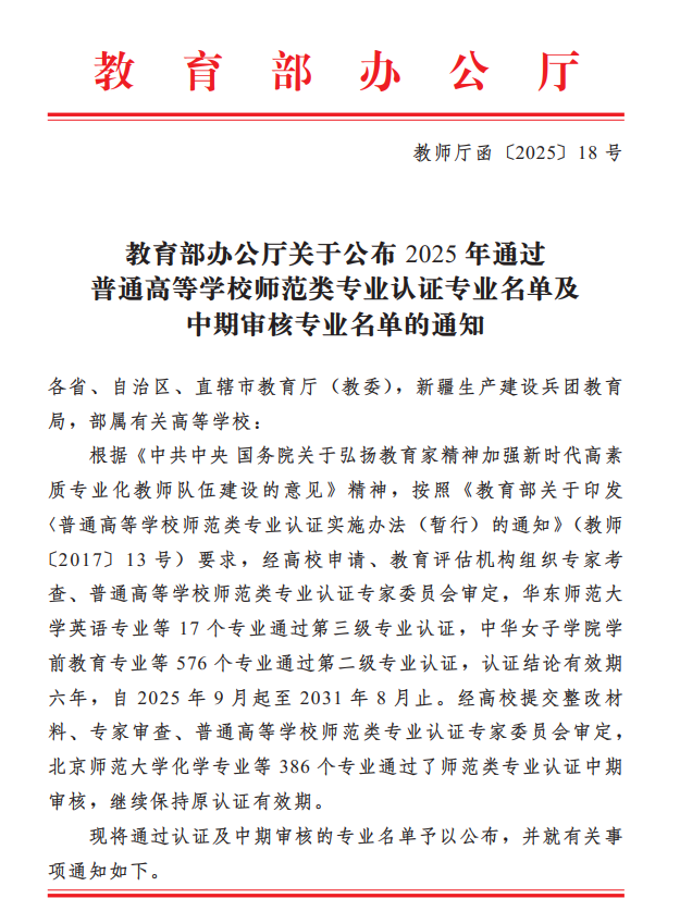 近日,教育部办公厅发布了《教育部办公厅关于公布2025年通过普通高等学校师范类专业认证专业名单及中期审核专业名单的通知》(教师厅函〔2025〕18号)。我院汉语言文学专业经学校申请、学校自评、教育评估机构组织专家考查、普通高等学校师范类专业认证专家委员会审定等程序,通过了第二级专业认证,认证结论有效期为六年。
